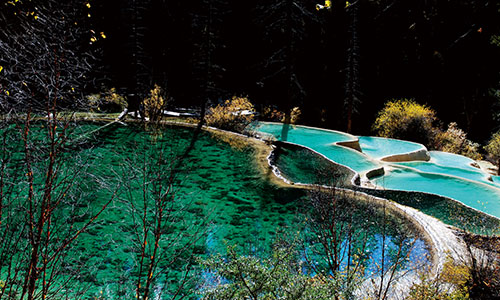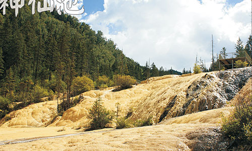 整个景区被 浩瀚无边的原始森林包围,四周地势险峻,海拔4000米以上的山峰就有10多座,峰峦叠嶂,曲涧幽深,云雾缭绕,给人一种空灵神秘、宁静幽远的感觉。进入 神仙池景区,沿着古朴的木制栈道慢慢前行,身旁是郁郁葱葱的密林,在翠绿的松柏和红桦的枝条间,不时有可爱的小松鼠穿过。成片的山坡被黄色、乳白色钙质所 包裹,形成奇特的盆状钙化池钙化坡,层层堆叠在面前,池中的水色发出一种独特的“少女蓝”,很是不食人间烟火的味道。神仙池核心景区的起点在仙女桥、结束 在摸佛洞。中间依次是水帘洞、金银滩、神泉、瑶池、青龙海、莲台彩池、仙女池、神蛙海。沿着栈道下来,全程将近两个小时。在这两个小时的行程里,完全可能 就你一个人被梯田般散落的海子和钙化池牵引着,走走停停。神仙池的日接待能力是6000人,作为对景区的保护每天我们最多只允许2000人进入,在这里, 没有如织的人潮,完全融入于自然。此景只应天上有,人间难得几回游。